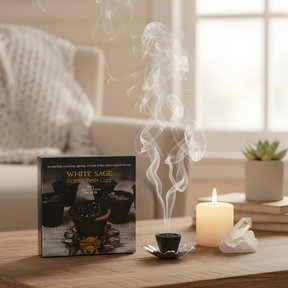 Pieni, tumma hartsiastia lähettää hiljaisen savunhajun, sen mattapintainen pinta lämpenee hopeansävyisellä, terälehtireunaisella pidikkeellä. Ilma täyttyy valkoisen salvia maanläheisestä, yrttisestä syvyydestä – savuisesta, puhtaasta ja lempeästi maadoittavasta. 🌿