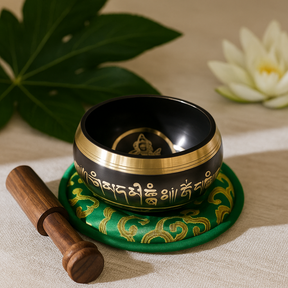Kulho on metallia, jossa on tumma sisäpinta, pehmeästi harjattu reuna ja kaiverrettu koristeellinen teksti ulkopuolella; pohjalla lepää kukkamaista motiivia muistuttava kuvio. Sen paino ja pyöreä muoto tukevat vakaata, resonoivaa värähtelyä. Puinen kapula on sileä ja mukava pitää; sitä vedetään reunan ympäri, jolloin se tuottaa kestävän, laulavan sävyn, ja kevyesti naputettuna se antaa kirkkaan, kellomaisen äänen. Pehmustettu rengaspeti — vihreä kultakirjailulla — tukee kulhoa niin, että ääni saa kukkia ilman vaimennusta. Yhteensopiva esityslaatikko, jossa on Green Tara -kuvitus, pitää setin koossa ja matkakunnossa yksinkertaisella arvokkuudella. 🌿