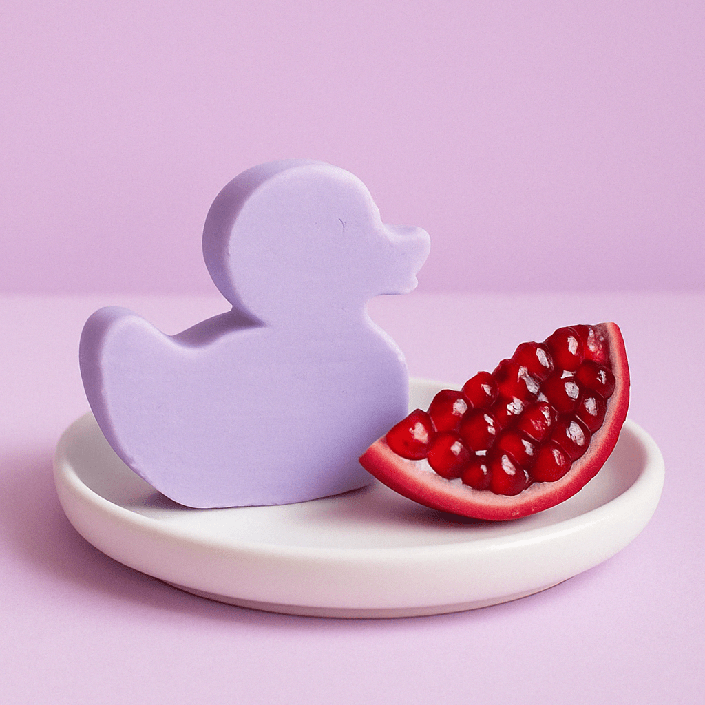 Pieni laventelinvärinen ankka lepää kämmenellä—sileä, mattapintainen ja hiljaisesti kohottava. Lämpimän veden kanssa se vapauttaa kirkkaan granaattiomenan tuoksun, jossa on raikas, pirteä vivahde, muuttaen nopean pesun rauhalliseksi, päivittäiseksi tauoksi. 🫧