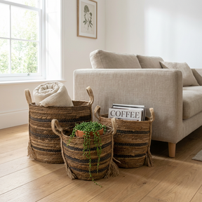 Kolmen suuren käsin kudotun korin sarja, valmistettu banaaninlehdestä ja meriheinistä, viimeistelty kokonaan luonnollisissa ruskean sävyissä. Nämä ovat tekstuuriltaan ja kooltaan tukevarakenteisia säilytyskoreja — suurin on 29 cm korkea ja 33 cm leveä — joissa on köysikahvat ja koristeelliset tupsut, jotka antavat niille selvästi käsityömäisen, luonnonmukaisen ilmeen. Kaikki kolme kokoa mahtuvat toistensa sisään, mikä tekee säilytyksestä tilaa säästävää.