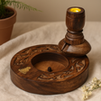 Tourné à la main dans un bois de manguier richement veiné, ce brûleur backflow allie fonction et poésie. La base circulaire est encadrée d'un motif de vigne sculpté ; une incrustation dorée capte la lumière. Un support vertical en marches s'élève jusqu'à une petite coupelle doublée de métal où repose le cône. Lorsqu'il brûle, le panache descend doucement dans le bassin encastré en dessous—silencieux, hypnotisant et calme.