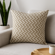 Le large motif en chevrons (herringbone) est tissé, non imprimé, offrant une texture plaisante que l'on peut voir et sentir. Les bandes beige et crème créent un contraste doux. La housse carrée de 40x40 cm est finie proprement avec des coutures cousues, des coins légèrement arrondis, et une fermeture éclair latérale discrète avec un petit tirette en métal. Le motif rappelle les textiles géométriques classiques indiens, appréciés pour leur équilibre et leur rythme, tout en conservant un look épuré et contemporain.