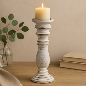 Le profil haut tourné au tour présente des courbes douces et des détails annelés, reposant sur une base ronde étagée pour l'équilibre. Un blanchiment vieilli flotte sur la surface, avec des tons bruns chauds et le grain naturel qui apparaît aux bords. La plateforme supérieure contient un creux peu profond noirci avec un bord net, offrant un siège défini à une bougie pilier. Lisse au toucher avec des reflets doucement usés, il apporte un caractère calme et patiné aux espaces contemporains comme classiques. 🤍