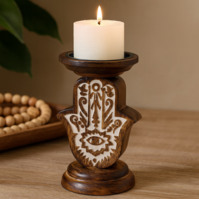 La lumière chaude de la bougie se pose sur le bois de manguier teinté foncé, le Hamsa sculpté captant de doux reflets blancs et apportant une présence calme et accueillante à la pièce. 🕯️
