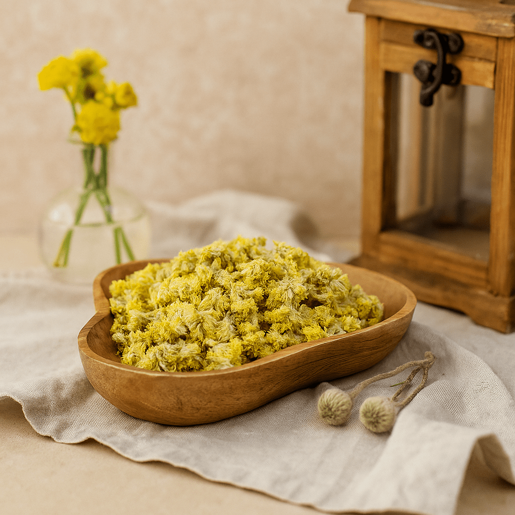 De petites têtes rondes, semblables à des boutons, se regroupent sur des tiges fines. Leur toucher est papier et léger, avec de fins poils argentés qui adoucissent les contours. La couleur crée un contraste agréable : des fleurs jaune vif contre des tiges vert pâle à fauve. Placé près de bois chaud, le look est rustique et calme—joyeux sans être criard. 🌾