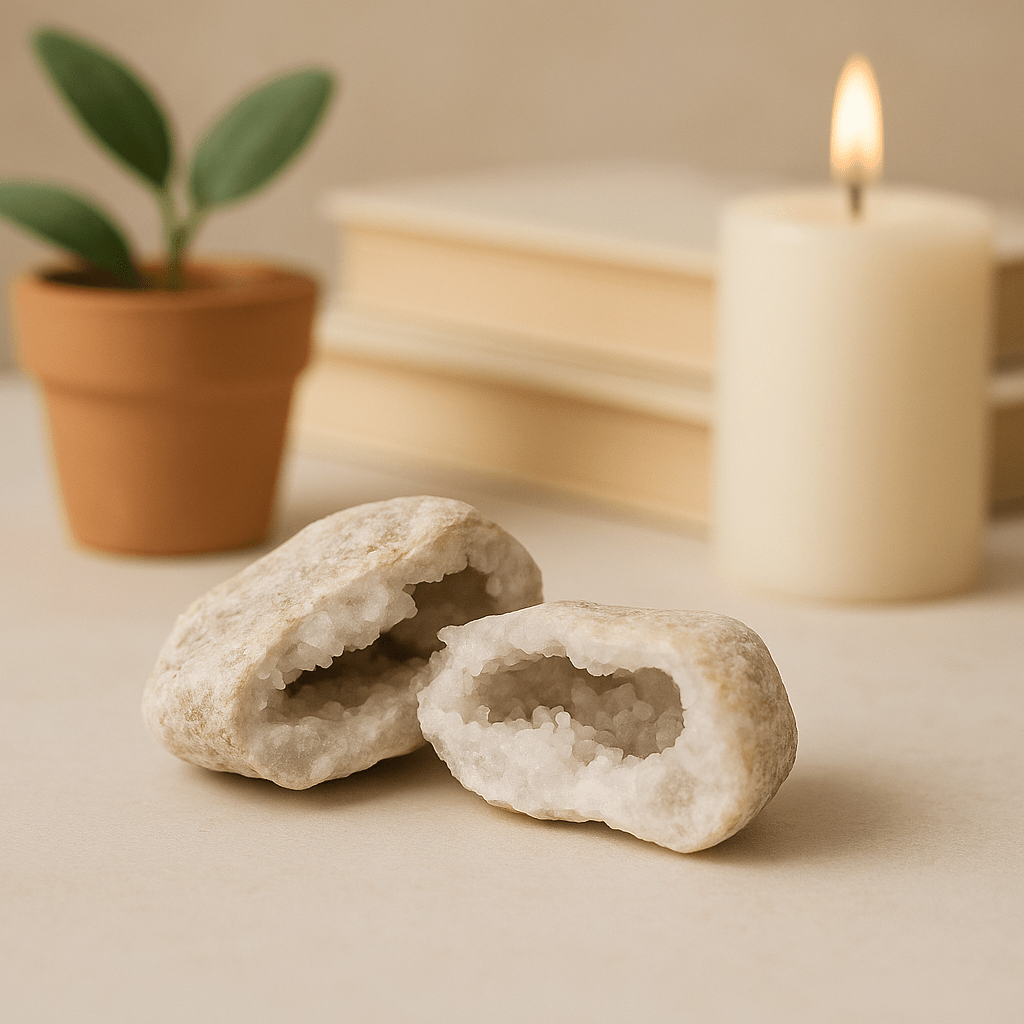 Formés au Maroc, ces petits géodes de 3–4 cm contiennent souvent de délicats amas de calcite et de quartz. Les moitiés ouvertes captent la lumière avec des pointes fines et une translucidité laiteuse ; les pièces intactes montrent de douces fissures et un grain, une carte silencieuse de leur fabrication. Tournez-les à la lumière du jour ou à la bougie — chaque facette scintille, puis s'adoucit. 🌍