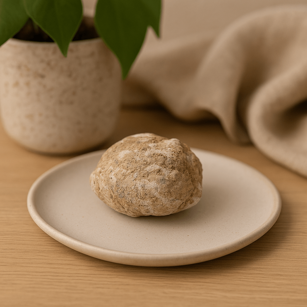 🪨 Dans la main, une pierre irrégulière, grossièrement arrondie — brun clair à gris-beige, mate et doucement granuleuse, avec de petites cavités et une touche poussiéreuse. Cet extérieur humble abrite un cœur creux et cristallin formé au fil du temps sous la terre. De nombreuses géodes marocaines s'ouvrent pour révéler calcite et quartz — l'architecture silencieuse de la nature.