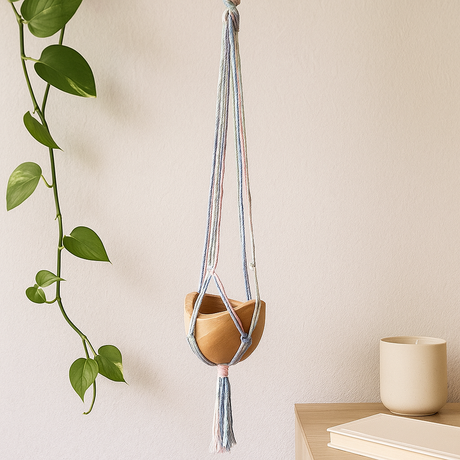 Porte-plante macramé tons pastel pour pots moyens