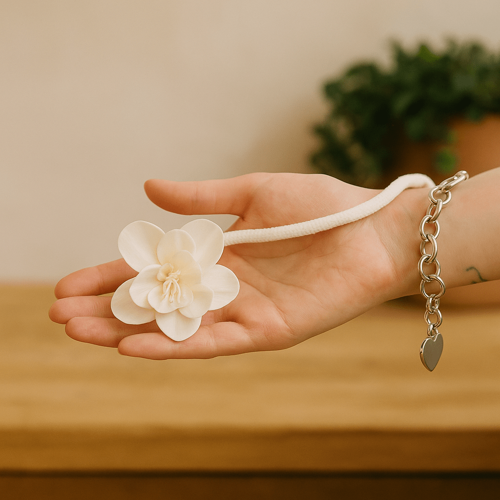 Des pétales ivoire doux reposent le long d'un cordon blanc, mats au toucher et légers comme l'air — une manière artistique de parfumer et décorer votre espace. 🌼
