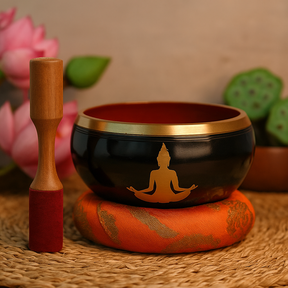 Le bol présente un bord lisse, légèrement épais pour un jeu facile, avec des côtés incurvés qui soutiennent un ton soutenu et résonnant. À l'extérieur, un noir profond encadre une silhouette dorée d'une figure méditative assise ; à l'intérieur, un bordeaux riche qui capte la lumière. Dans les traditions bouddhistes, l'image du Bouddha est un doux rappel de compassion, de pleine conscience et de paix intérieure—souvent conservée dans les espaces de méditation comme symbole d'une conscience stable.