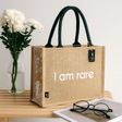 Conçu pour contenir facilement les essentiels du quotidien, il possède une base et des côtés structurés qui le maintiennent debout, avec des coutures renforcées pour une solidité fiable. La fibre naturelle respire, ce qui permet aux fruits, légumes et repas emballés de rester aérés ; une fois terminé, il se plie à plat pour un rangement facile. Le jute est un matériau renouvelable d'origine végétale, et ce sac réutilisable soutient une routine à faible déchet et consciente. L'inscription claire "I am rare" à l'avant offre un doux rappel de votre individualité, tandis que les motifs latéraux subtils ajoutent une note calme et botanique. ♻️