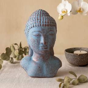 D'un bleu mat doux avec de légers reflets cuivrés, cette tête de Bouddha dégage une présence calme et stable. Sa silhouette compacte apporte un calme équilibré à une étagère, une console ou un coin de jardin, invitant la pièce à respirer.