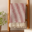 🧶 Une pièce en coton tissé avec une main douce et texturée — des fils rubis et crème se croisent pour former un motif dense en chevrons, fini par de longs pompons doux qui tombent silencieusement au bord.