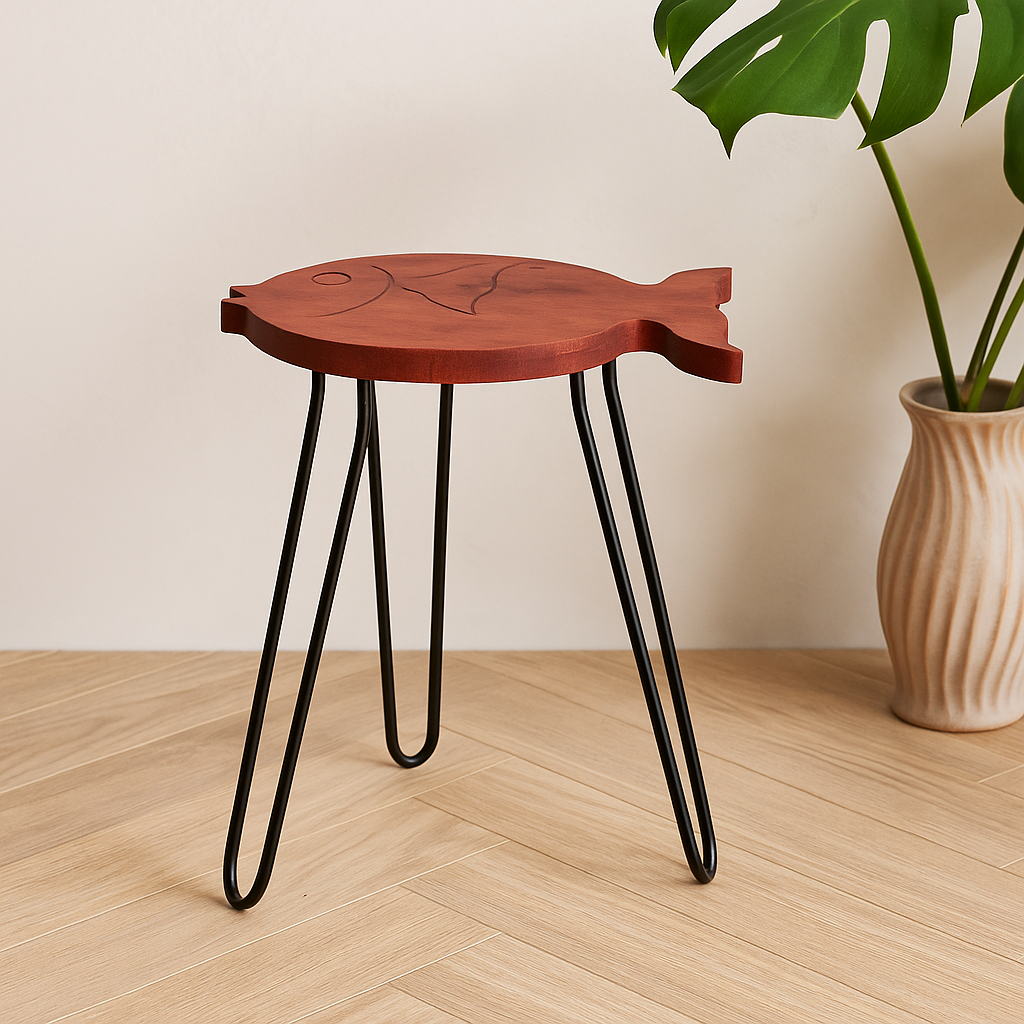 Le plateau en bois massif est solide et parfaitement fini, avec des bords doucement arrondis qui sont agréables au toucher. De subtiles lignes sculptées dessinent la silhouette stylisée d'un poisson, ajoutant du caractère sans fioritures. Dans de nombreuses traditions, le poisson est associé au flux et à l'abondance — un rappel apaisant de l'adaptabilité et du mouvement de la vie. Reposant sur des pieds épingles ouverts et équilibrés, le tabouret est durable et stable tout en gardant une empreinte légère. Utilisez-le comme siège quotidien, table d'appoint pour une tasse de thé, ou petite scène pour une plante ou une lampe ; son charme organique s'harmonise facilement avec différents intérieurs. 🌊