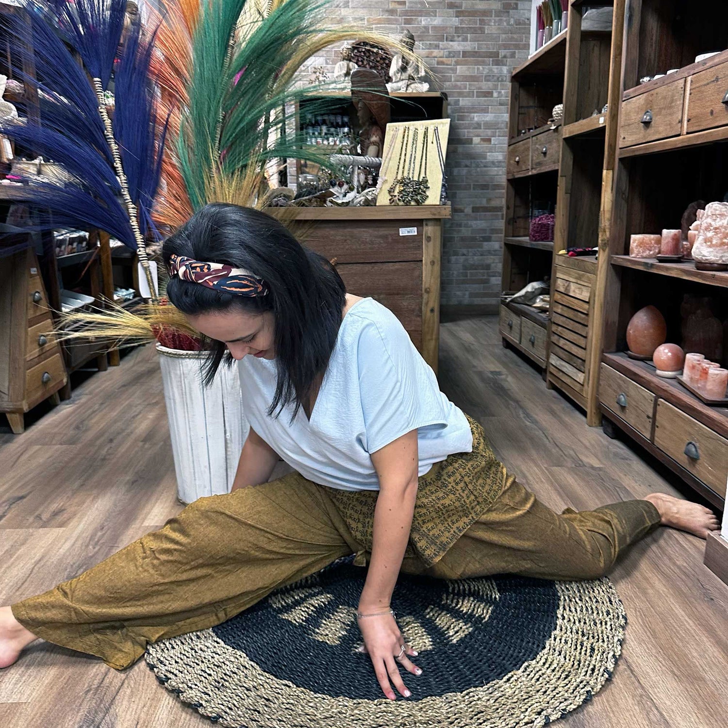 Coupé dans une jambe droite et décontractée avec des ourlets longueur totale, ils offrent une liberté spacieuse dans le mouvement et le calme. Le tissu mat et respirant bouge avec vous et procure une sensation d'ancrage, favorisant l'équilibre dans les postures debout et la facilité dans les transitions. Une taille ajustable à nouer crée un ajustement sécurisé et personnalisé pour toutes les tailles, tandis que la teinte terreuse brun-olive avec un léger moucheté maintient un look calme et polyvalent. Une bande concentrée de petits symboles de style mantra entoure la ceinture — un point focal discret au centre de votre corps.