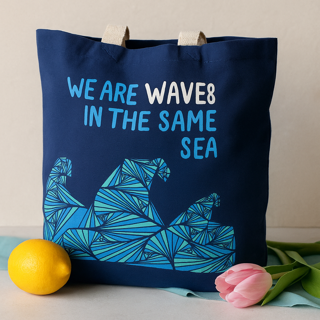 Izrađena od čvrstog pamučnog platna u tamnoplavoj boji, djeluje pouzdano, a da nije teška. Dvije krem bijele ručke udobno leže na vašem ramenu. Prednja grafika prikazuje stilizirani val u nijansama plave i tirkizne s čistim crnim obrubima, uz nježni podsjetnik "WE ARE WAVES IN THE SAME SEA" — jednostavan znak povezanosti i zajedničke ljudskosti. Otvoreni vrh omogućuje jednostavno pakiranje i brz pristup, dok se mekani oblik može sklopiti kad se ne koristi. Velikih dimenzija (približno 38 × 45 cm), prati vas s tržnica do posla, putovanja i osobnih rituala s mirnom lakoćom. 🌿
