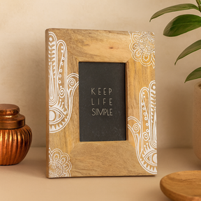 Svijetlosmeđa do srednje smeđa nijansa manga drva i prirodna varijacija teksture donose nježnu toplinu na police, stolove i konzole. Cvjetni, mandala i paisley uzorci duž stranica i kutova naneseni su s mekim, ručno crtanom osjećajem, dodajući karakter bez pretrpavanja slike. U mnogim tradicijama, mandale simboliziraju ravnotežu i cjelovitost; paisley (boteh) povijesno je povezan s vitalnošću i kontinuitetom. Ovdje služe kao poštovan znak—ukras koji poziva na zastanak. Okvir odgovara slici dimenzija 10 x 15 cm, ukupno mjeri približno 26 x 20 x 2 cm i lako stoji na stolu zahvaljujući stražnjem stalku.