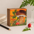 Pravokutni oblik je ugodan na dodir, s prirodnom teksturom vidljivom duž stranica i gornjeg ruba. Dva mala metalna šarka omogućuju lako otvaranje i zatvaranje. Na prednjoj strani, bogato tiskana ploča blista narančastim gradijentom i detaljnim botaničkim gljivama—smeđim šeširima s blijedom donjom stranom, narančastim lijevkastim oblicima i malim crvenim šeširom s bijelim točkicama—među mahovitim zelenilom. Stavite je kraj kreveta za nakit, na radni stol za papirnati pribor ili u hodnik za uspomene koje volite imati pri ruci. Promišljen poklon za ljubitelja prirode ili nekoga tko stvara miran kutak kod kuće. 🌿