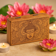Izrezbarena od svijetlog drveta s prirodnim, mat završetkom, ova srednje velika pravokutna kutija spaja dnevnu korisnost s tihom umjetnošću. Fino ugravirano lice Bude nalazi se u sredini poklopca, uokvireno simetričnim listnim uzorkom s nježnim, paisley-like zavojima; tamnije linije stoje u mirnom kontrastu s glatkom površinom. Poklopac na šarkama se čisto otvara, a ravna baza stabilno stoji na stolu, noćnom ormariću ili polici. 17 × 10 × 4.2 cm. 🪷