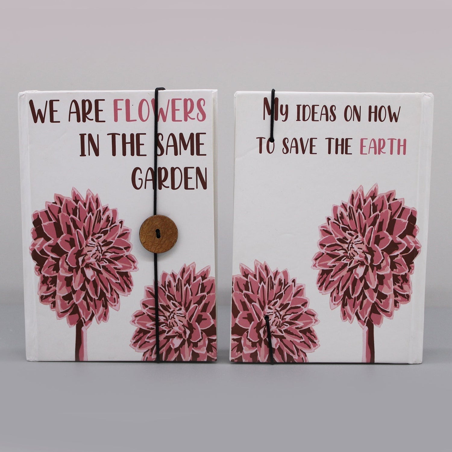 Čiste bijele korice oživljene nježnim ružičastim cvjetovima i riječima „WE ARE FLOWERS IN THE SAME GARDEN“ dočekuju ruku s mirnom sigurnošću. Crna elastična traka omotava se oko okruglog plutenog gumba — mali, prizemljujući gest prije otvaranja stranica. Unutra, reciklirani, neporavnati papir nudi tihi prostor gdje se misli, emocije i namjere mogu smiriti i ukorijeniti. 🌸