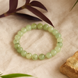 Hladne, glatke žad perlice nježno leže na zapešću u blijedo zelenoj boji. Prozirne površine hvataju svjetlo s mekim sjajem, dok suptilne mrlje i niti inkluzija pokazuju prirodni karakter kamena. 🌿