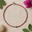 Hladni, glatki diskovi klize ispod prstiju, njihov crvenkasto-rozi sjaj susreće mirni tirkiz. Izrađeno u Nepalu, ovaj niz perlica nosi i ljepotu i priču — tihu poveznicu između prirodnih materijala, vještih ruku i značenja koja biramo nositi. 🏔️