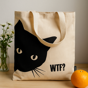 Tkanina nalik platnu osjeća se lagano, ali čvrsto u ruci, s urednim vidljivim šavovima za pouzdanu čvrstoću. Usklađene naramenice udobno sjede bez žuljanja, a prostrani unutrašnjost prima tržničko povrće, bilježnicu, šal ili putne potrepštine. Smjeli crni print — znatiželjna mačka koja virka sa strane s iskrenim "WTF?" — dodaje grafički znak koji održava izgled minimalnim i modernim. Nema kopči ni metalnih dijelova, pa se lako navlači i skida te se može sklopiti na ravno kad dan završi. 🌿