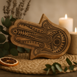 Izrezbarena iz komada punog drveta, prirodni uzorak drveta vidljiv je kroz svijetlo do srednje smeđu nijansu, istaknut tamnijim, visokokontrastnim urezanim motivom. Stilizirani oblik Hamsa ima nježno zaobljene rubove i uravnotečenu debljinu koja u ruci djeluje stabilno; na vrhu se nalazi središnje oko uokvireno finim linijama, točkicama, kapljicama i valovitim ukrasima. Dimenzija 30 × 20,5 × 2,5 cm, služi za držanje čaja i malih zalogaja, stabilizira pića ili postaje pozornica za svijeće i svete predmete tijekom trenutaka meditacije. Hamsa—otvorena ruka prisutna u zapadnoazijskim i sjevernoafričkim tradicijama, uključujući židovsku i islamsku kulturu—široko se smatra znakom zaštite i dobre volje; središnje oko često se tumači kao svijest i briga, podsjetnik dobrodošao u mnogim domovima. 🪬