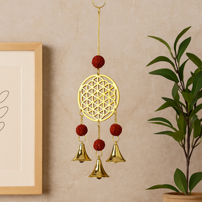 Trio poliranih mesinganih zvona njiše se ispod otvorenog medaljona Cvijeta života, hvatajući svjetlo toplim, reflektirajućim sjajem. Zemljani tonovi rudraksha perli daju nježnu teksturu i prizemljenje duž niti. Sa svakim povjetarcem, zvono odgovara mekim, uravnoteženim tonovima—tihi podsjetnik na prisutnost i suptilan tok koji prolazi kroz vaš prostor. 🎐