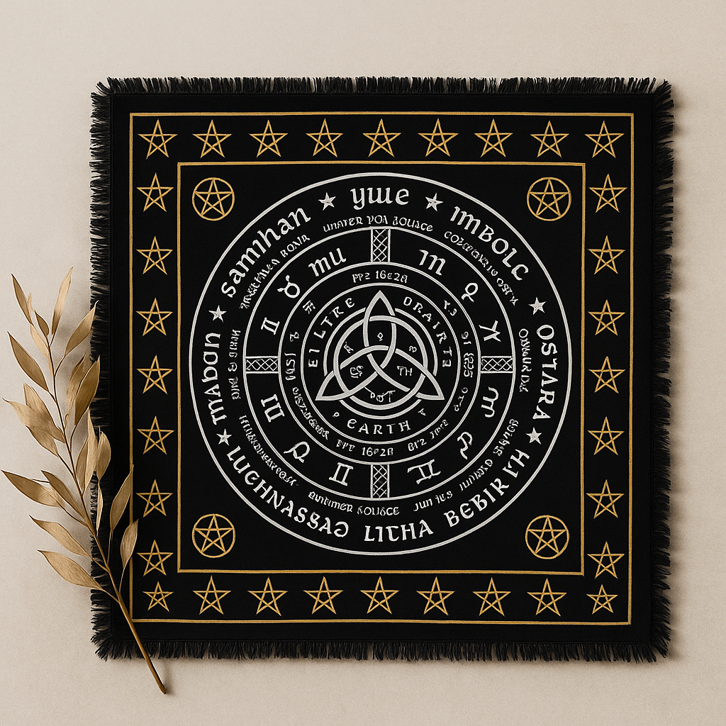 Indiában készült, ez a négyzet alakú textil gazdag fekete háttérrel rendelkezik, amely kiemeli a feltűnő fehér és arany mintázatot. Közepén egy fehér triquetra található, egy összefonódó csomó, amely az élet, a halál és a újjászületés örök körforgását szimbolizálja, körülvéve a nyolc évszakos fesztivált. Minden fesztivál, a Samhaintól a Mabonig, az időtlen földi tánc emlékeztetője a napfordulók és napéjegyenlőségek között, amelyeket az állatövi jelek jelölnek, s amelyek a kozmoszról suttognak. A szegélyt pentagrammok díszítik, amelyek egy csipetnyi ezoterikus eleganciát adnak, míg a rojtos szél lágyítja a megjelenést, érintésre és interakcióra hívva.