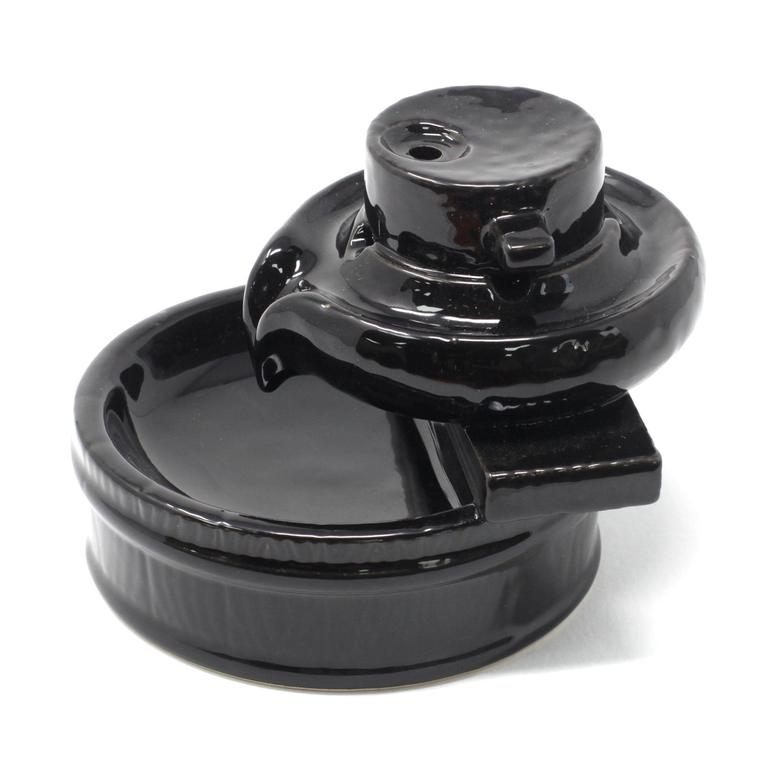 Fényes fekete kerámiából készült, egyszerre tárgy és hangulat. A lekerekített, bordázott talp megalapozza a formát; a finom vízszintes bordák megfogják a vízesést; a diszkrét tartó középre helyezi a kúpot. Minimalista, tükröződő és csendesen drámai egy íróasztalon, oltáron vagy teás tálcán. 🖤