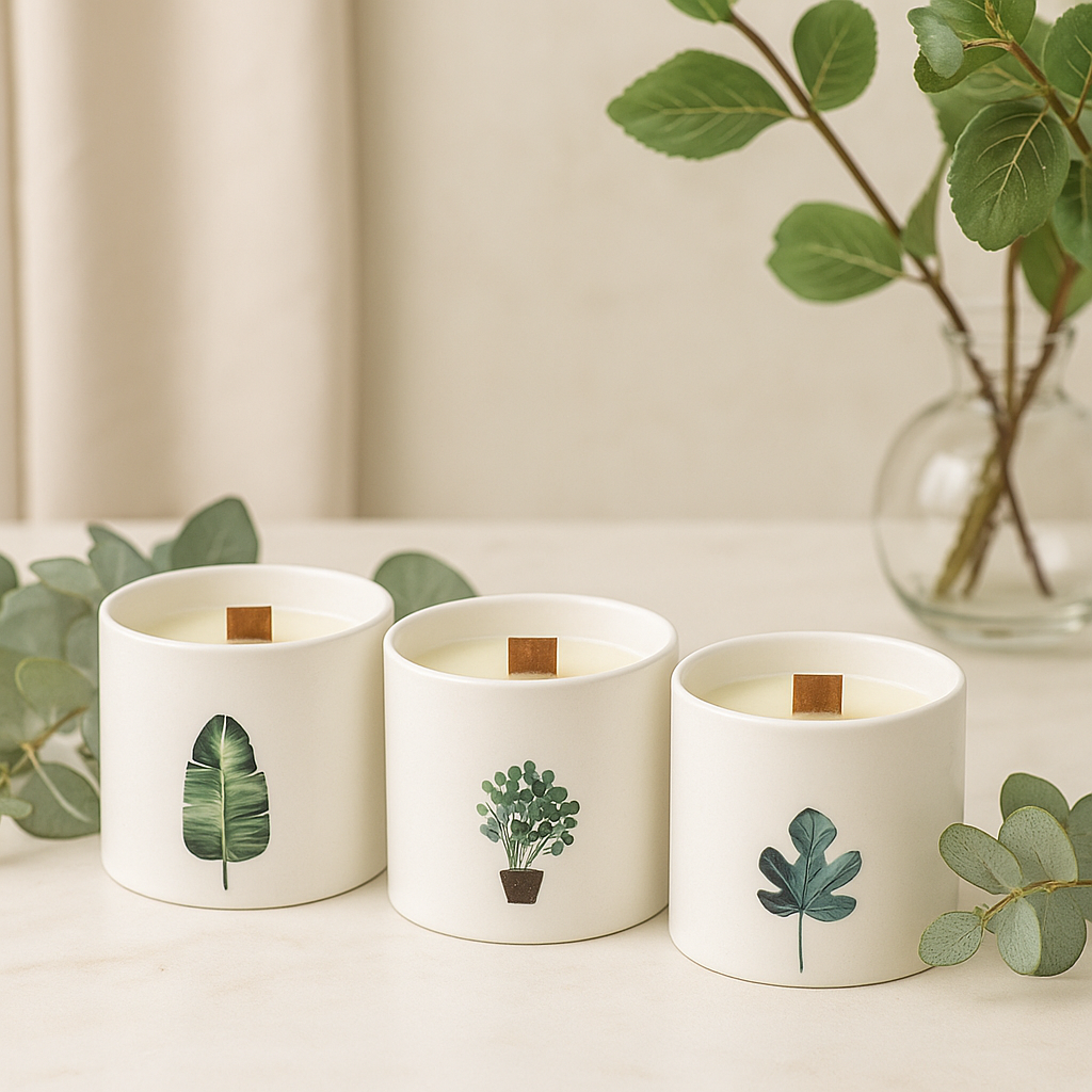 Egy puha fa kanóc halk pattogással kap lángra, és a világos krémszínű szójaviasz kezd ragyogni. Egyszerű fehér edényében, amelyet egyetlen zöld ág díszít, a láng és az illat találkozik — meleg, növényi csendet hozva a szobába. 🕯️