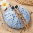 Ez a kompakt acél nyelvű dob nyolc szirmokra emlékeztető hangot hordoz, minden hang meleg és harangszerű, lágy csillogással a széleken. Természetes fa ütőkkel, matt fekete fejjel, amelyek lassú lüktetésekre vagy játékos, intuitív ritmusokra hívnak. A fényes Blue Sky felület—világoskék fehér márványmintával és finom arany pöttyökkel—megragadja a tekintetet, miközben a rezonancia megnyugtatja a testet. Indiában készült, első játékosokat és tapasztalt hallgatókat egyaránt könnyed, tudatos áramlásba hív. 🎐