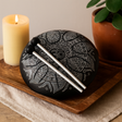 Selyemfekete, sima, alacsony profilú acél nyelvdob formájú, felületét Indiában finoman gravírozták Om mandalával—koncentrikus szirmokkal, pontokkal és vonalakkal, amelyek lágy szürkében ragyognak. Az indiai hagyományokban az Om az univerzális hang és a belső csend szótagjaként tisztelt; a mandala az egyensúlyt és teljességet szimbolizálja. Együtt nyugodt fókuszpontot kínálnak a szemnek, miközben a hangjegyek lágy, meditatív glóriává olvadnak össze—a mellékelt puha fejű kalapácsokkal vagy az ujjhegyekkel játszva. 🕉️