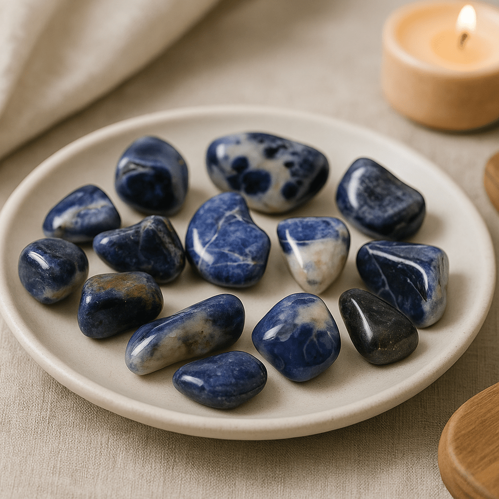 Hűvös és sima a tenyérben, ezek a csiszolt szodalit kavicsok mélykék mezőket tárnak fel, amelyeket lágy fehér erezetek szőnek át. A föld csendes bölcsességének hordozói, amelyeket megmunkáltak, hogy előhozzák a belső szépséget és az állandó, finom jelenlétet—társak a meditációhoz, gyógyító gyakorlatokhoz és a tudatos élethez. 💙