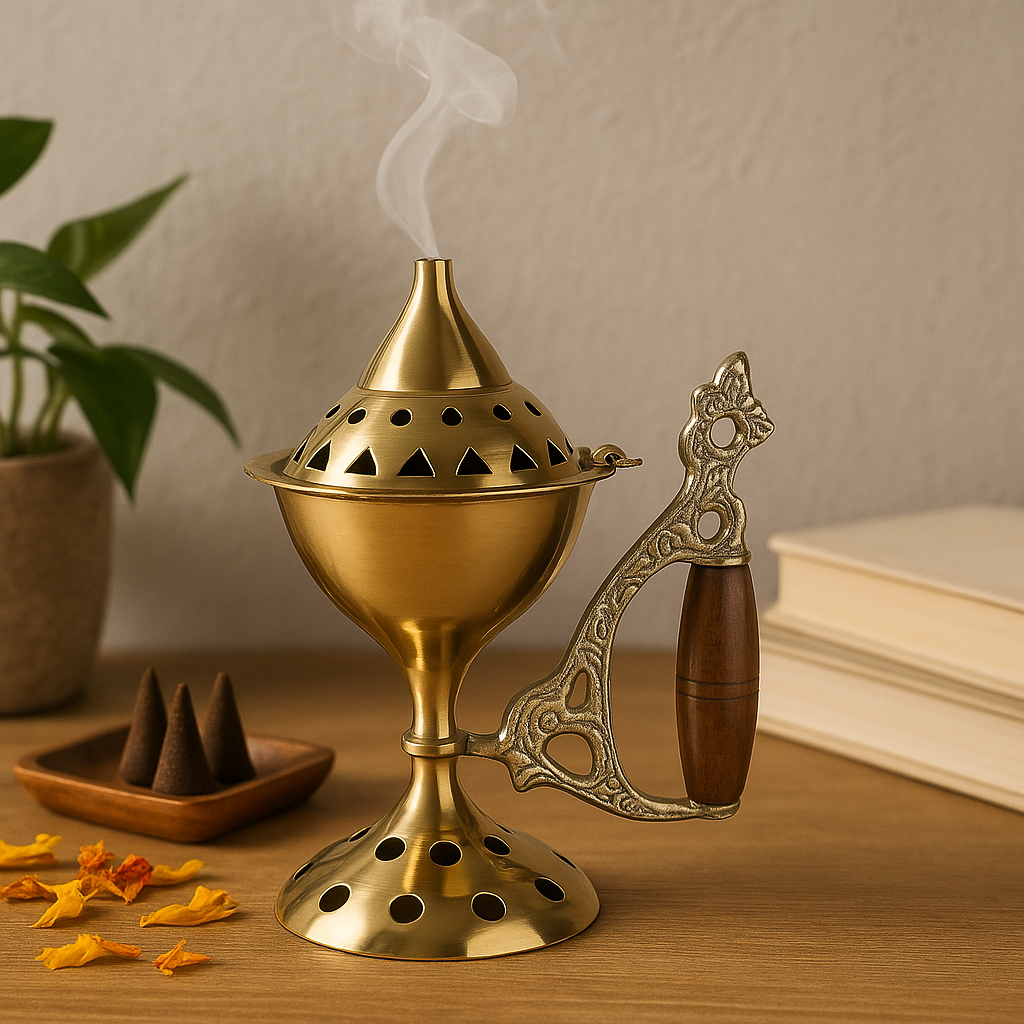 Az első füstszál a sárgaréz fedőn át emelkedik, egy nyugodt illatfonal, melyet a meleg fém tart. Aranyfényűre polírozva, ez a fogantyús füstölő csendes kegyelemmel támogatja a napi rituálékat, visszatükrözve India hosszú sárgarézműves hagyományát – különösen Moradabadban, ahol az ilyen formákat generációk óta készítik és használják. 🌿🕊️
