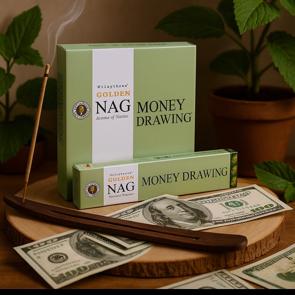 Indiában készült, a masala füstölők hosszú kézműves hagyományán belül, tükrözve a füstölő mindennapi szerepét ott – kíséri az imát, a gondolkodást és a napot formáló apró rituálékat. A világoszöld és arany doboz tiszta, modern dizájnt hordoz, rajta jól olvashatóan a „Golden Nag Money Drawing” és az „Aroma of Nature” felirat – egy gyakran szándékmegfogalmazó keverékekhez használt kifejezés, itt egyszerűen témaként, nem ígéretként kínálva. 🕯️