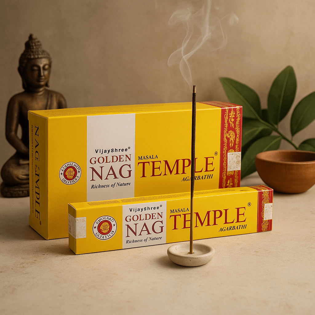 🛕 Az első füstkígyó felszáll, és a szoba megpuhul — a meleg szantálfa finom édességgel bontakozik ki, a levegő megáll és figyelmes lesz, ahogy a Golden Nag Temple kezd ragyogni.
