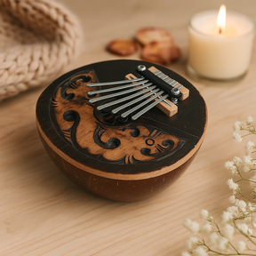 A tenyeredben tartva, a hüvelykujjaid megtalálják a sima fémfogakat, és előre-hátra mozgatják őket; egy egyszerű kéthangos ritmus mintává, majd dallammá válik. Könnyű megtanulni tapintás alapján, lassú lélegzeteket és nyugodt szólamokat hívva elő, akár új vagy a zenében, akár visszatérsz hozzá. Bali szigetén kézzel készítve, lekerekített, tál-szerű formával és finoman faragott fa tetővel, könnyen hordozható és lágyan szól—kedves a szobatársakhoz és az éjszakai falakhoz. A szubszaharai Afrika lamellofon hagyományaiban gyökerezik, a kalimba (hüvelykujj-zongora) régóta része a kis, bensőséges zenélésnek—közel a kézhez, közel a szívhez. 🌿🥥
