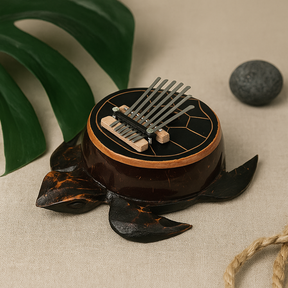 Könnyedén pihen a kézben; a hüvelykujjaid hűvös fémfogakkal találkoznak, melyeket egy puha rugó tart. Két vagy három hang, balról jobbra ismételve, egyszerű mintává alakul, amit elmélet vagy képzés nélkül formálhatsz. Egy sima, kézzel faragott talp fényes felső résszel érintésre hív, miközben a fogak sora egy kis híd fölött helyezkedik el, készen az egyszerű játékra. Az afrikai lamellofon hagyományokból, például az mbirából eredő kalimba régóta hordoz bensőséges zenét, amely kis összejövetelekre és személyes elmélkedésre szolgál. Teknős formájú, utalva egy olyan szimbólumra, amelyet sok kultúra a türelemmel és állhatatossággal társít — egy csendes emlékeztető, hogy óvatosan haladj. 🐢