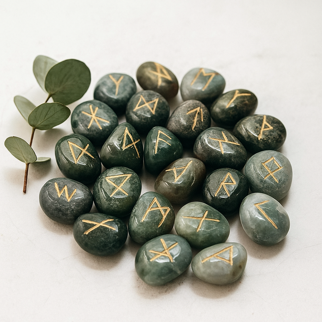 Itt a rúnák sima, lekerekített mohaachát kavicsokba vannak gravírozva — tapintásra fényesek, természetesen foltosak sötétzöld alapon világos szálakkal, és fémes arany pigmenttel töltöttek a tisztaság érdekében. A tapintható felület és a kövek finom csattogása jelenlétre hív. A készlet 24 rúnaszimbólumot tartalmaz; sok modern készletben van egy üres kő is, amelyet a hagyományod szerint használhatsz vagy félretehetsz. 🪨