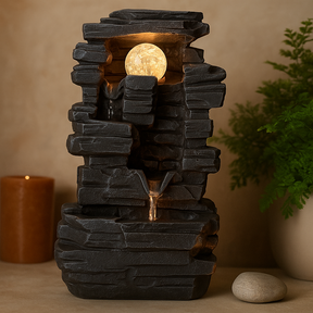 Hűvös, sötét „kő” emelkedik egymásra rakott pala toronyként, a víz minden peremen összegyűlik, mielőtt finom zuhatagként a következőre csúszik. A matt, kőhatású felület lágyítja a fényt, míg a tetején lévő áttetsző gömb csendes ragyogást kap. 💧