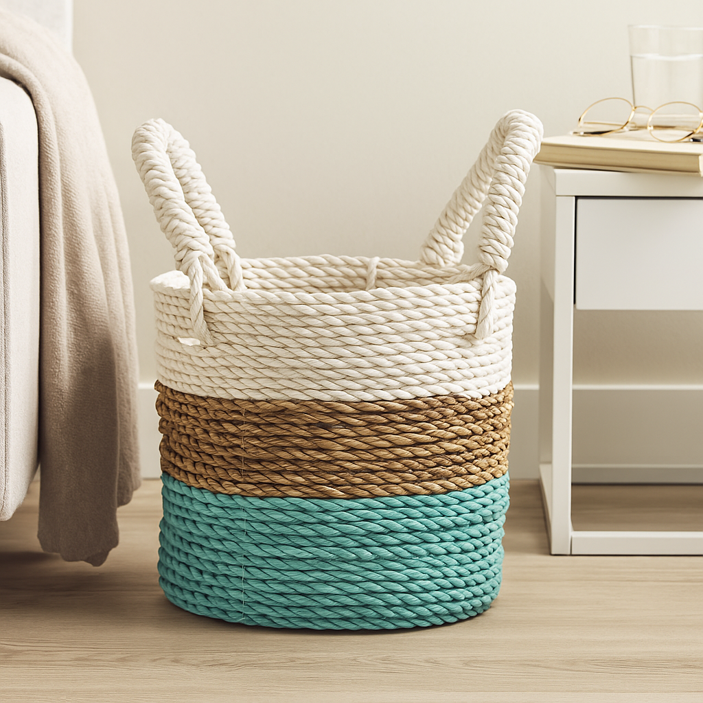 - 🧺 Mindennapi erősség: Megerősített perem, rugalmas oldalak és fonott hurkos fogantyúk a kényelmes hordozáshoz.