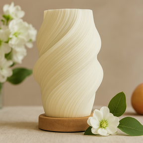 Egy szoborszerű asztali lámpa váza-szerű sziluettel. Áttetsző törtfehér árnyalata finom csavarulatokba és redőkbe hajlik, lágyítva a fényt egy nyugodt, hangulatos fényáradattá. Egy lekerekített természetes fa talp meleg, organikus érintéssel ad stabilitást a formának. ✨