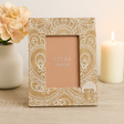 A téglalap alakú keret világosbarna erezetet és tiszta, derékszögű éleket mutat. Portré nyílása 13 × 18 cm-es képekhez illeszkedik, stabil állványtámasza polcokra, íróasztalokra vagy konzolokra alkalmas; teljes mérete kb. 28 × 23 × 2 cm. Finom fehér mintázat, amely a mandala művészetét idézi, fekszik a fán, egy kis napernyő motívummal az egyik sarokban. Dél-ázsiai és buddhista hagyományokban a mandalák gyakran az egyensúlyról és teljességről szólnak, míg a napernyő (chatra) a menedéket és tiszteletet szimbolizálja—itt egy finom tudatosságot sugalló jegyet ad, amely lehetővé teszi, hogy a kép maradjon a fókuszban. A fa és a fehér csendes kontrasztja könnyen illeszkedik a modern, természetes és gyűjtött enteriőrökhöz. 🌿