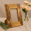 Világos tónusú mangófa anyagból készült, látható erezetű, a téglalap alakú profil sötét, vésett vonalrajzokkal díszített—virágos és paisley-szerű motívumok finom szemformákkal a széleken. A dél-ázsiai kézművességben a paisley (boteh) gyakran a növekedést és folytonosságot jelképezi, míg a szemformák sok kultúrában az éber gondoskodást szimbolizálják. Itt finoman jelennek meg, tisztelegve az indiai művészet előtt, miközben a kép központi marad. A nyílás 13 × 18 cm-es nyomatokhoz illeszkedik; a teljes méret kb. 28 × 23 × 2 cm. Egy kihajtható állvány könnyű asztali kiállítást tesz lehetővé, és kényelmesen illik rusztikus, boho vagy modern terekhez. 🌿