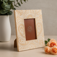 Téglalap alakú, széles portrényílással 10 × 15 cm-es képekhez, finom, fehérre festett vonalrajzot visel—paisley- és csipkeszerű részletekkel, pontozott kiemelésekkel—a természetes fa felületén. Egy kis Buddha körvonal pihen a mintában, csendes és tiszteletteljes. Sok hagyományban a Buddha-ábrázolás együtt jár az együttérzéssel, tudatossággal és belső békével; itt finom emlékeztetőként szolgál, hogy álljunk meg és legyünk jelen. Az állvány-stílusú hátlap stabilan áll egy polcon, éjjeliszekrényen vagy íróasztalon, és a világos fa tónus könnyen illeszkedik mind a minimalista, mind a rétegzett belső terekbe. Teljes méret: 26 × 20 × 2 cm.