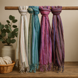 Cotone morbido, un lieve scintillio d'oro e una delicata stropicciatura sotto le dita. Questo lungo rettangolo leggero scivola facilmente intorno al collo o alle spalle. Le righe verticali variano in larghezza e tonalità, con fini nappine a ogni estremità. I colori variano da pezzo a pezzo—a volte toni sereni di teal e verde, altre volte magenta vibrante, ruggine calda o pastelli morbidi—sempre toccati da un sottile filo dorato. ✨