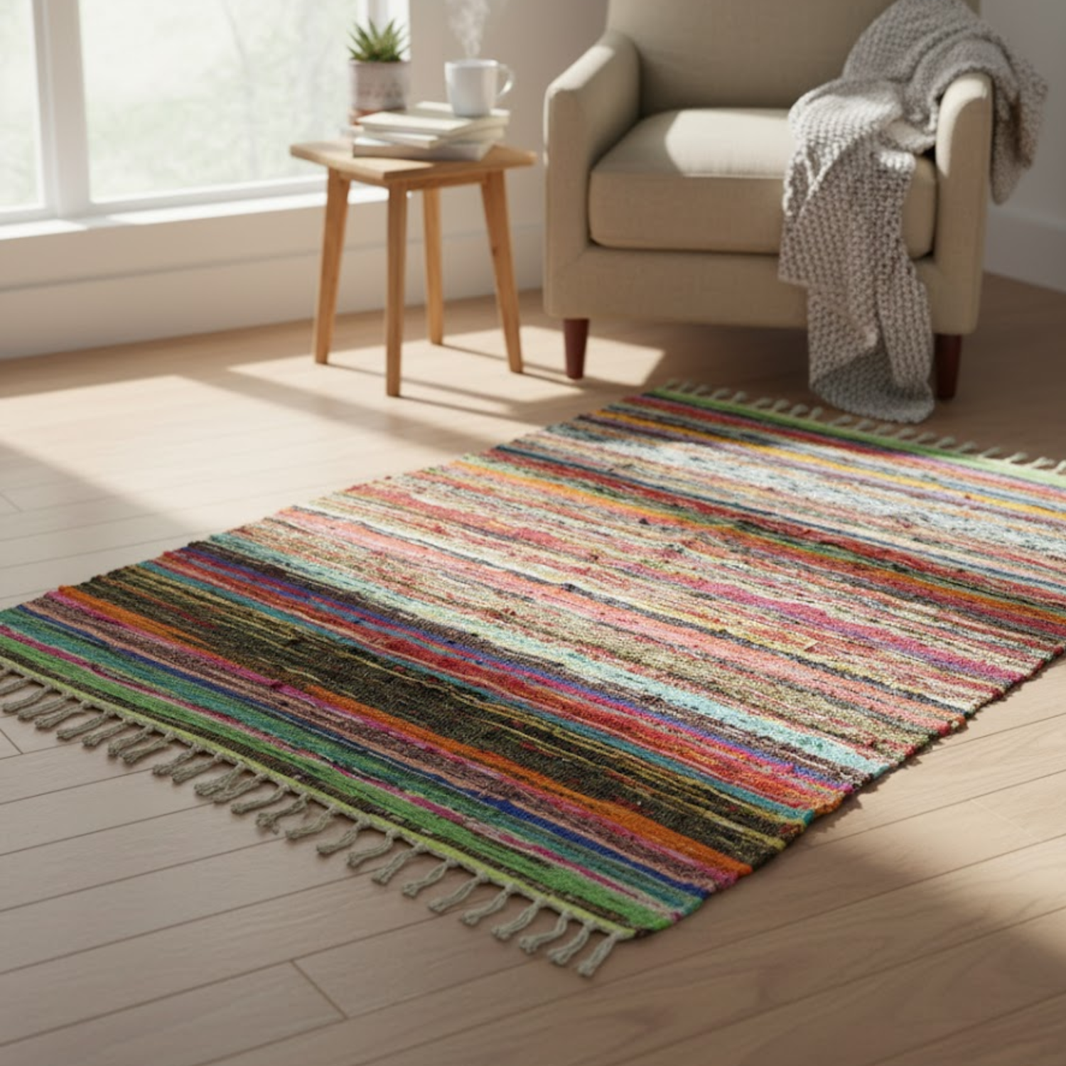 - 🌈 Colore vivace e radicato: Strisce multicolori, non ripetitive, che aggiungono profondità e calore a qualsiasi stanza.