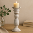 Il profilo alto, tornito al tornio, presenta curve dolci e dettagli ad anelli, poggiando su una base rotonda a più livelli per equilibrio. Una finitura sbiancata invecchiata sfuma sulla superficie, con toni caldi marroni e venature naturali che spuntano ai bordi. La piattaforma superiore ospita un incavo poco profondo annerito con un bordo netto, che offre un posto definito per una candela a colonna. Liscia al tatto con evidenziazioni leggermente consumate, porta un carattere calmo e vissuto sia negli spazi contemporanei che classici. 🤍